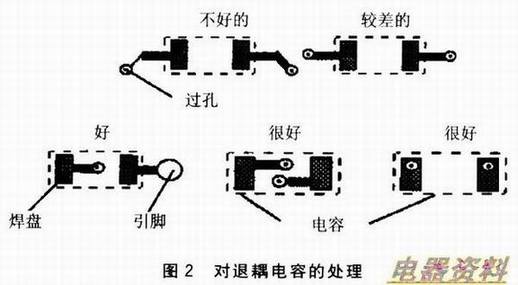 在DSP系统中,对各个集成电路安放退耦电容,像DSP、SRAM、Flash等,在芯片的每个电源和地之间添加,而且要特别注意,退耦电容要尽量靠近电源提供端(source)和IC的零件脚()。保证从电源提供端(sotlrce端)和进入IC的电流的纯净,并且尽量能让噪音的路径缩短。如图2所示,处理电容时,使用大的过孔或多个过孔,且过孔到电容间的连线应尽量短、粗。2个过孔距离远时,因为路径太大,不好;最好的就是退耦电容的2个过孔越近越好,可以使噪声以最短路径到地。