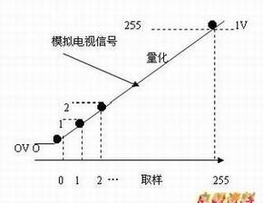 一幅电视图像从左至右扫描一行,摄像机输出的这一行电视信号在行扫描正程52微秒时间内每一点均有值,例如该电压在0至1伏之间的变化,这就是模拟电视信号。而信号是由模拟电视信号数字化而来的。在数字化时,一行52微秒时间内不是每一点均传送,而只传送有限个点的值,如传送720个点的值,这称为时间上的离散化,称为取样。横坐标上示出了取样点的编号,这里只取了256个样。而对于每一个点的值,从0至1伏,有无限多个值,数字化后将原来的连续值四舍五入到有限的层次上,如0至1伏分成256个层次,输出即为256个值,可用8位数表示,这是幅度上的离散化,称为量化。量化后的值要用二进制数码进行表示,称为。可使用自然二进码、格雷码及折叠二进码等方法进行编码。对模拟电视信号进行取样、量化及编码后变换成二进码输出,即为数字电视信号或称数字电视()信号。