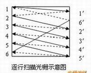每一帧图像均是由电子束顺序地一行接着一行连续扫描而成,这种扫描方式称为逐行扫描。要得到稳定的逐行扫描图像,每帧图像必须扫描整数行。左图为逐行扫描光栅示意图,该图是由6行扫描线组成的一幅光栅,或称一帧图像。其中实线为从左至右的行扫描线,是图像有效显示时间,称为行扫描正程;而虚线为每行的回扫线,不显示图像,称为行扫描的逆程。每一帧的回扫时间较长,图中帧扫描正程为5行时间,而第6行为帧扫描逆程即帧回扫时间。