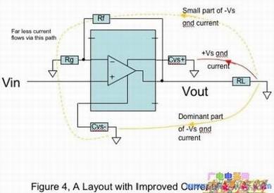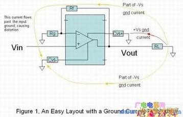 电流流过阻抗最小路径的概念是不正确的。电流在全部不同阻抗路径的多少与其成比例。在一个地平面,常常有不止一个大比例地电流流经的低阻抗路径:一个路径直接连至旁路电容;另一个在达到旁路电容前,对输入形成激励。图1示意了这两个路径。地回流电流才是真正引发问题的原因。