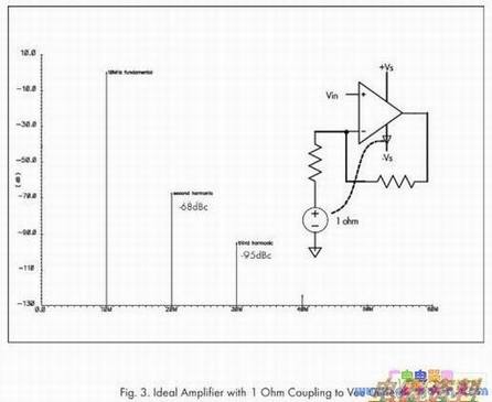 当只有正弦波的一个极性分量受到扰动时,产生的波形就不再是正弦波。用一个100Ω负载模拟理想放大器,使负载电流通过一个1Ω,仅在信号的一个极性上耦合输入地电压,则得到图3所示的结果。傅立叶变换显示,失真波形几乎全是-68dBc处的二次谐波。当很高时,很容易在PCB上生成这种程度的耦合,它无需借助太多PCB特殊的非线性效应,就可毁掉放大器优异的防失真特性。当单个运算放大器的输出由于地电流路径而失真时,通过重新安排旁路回路可调节地电流流动,并保持与输入器件的距离,如图4所示。