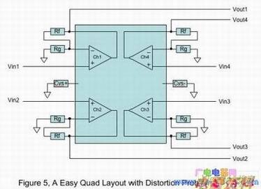 图5给出了四放大器布局的简单方法。大多器件直接连至四放大器管脚。一个电源的地电流可扰动另一个通道电源的输入地电压和地电流,从而导致失真。例如,四放大器通道1上的(+Vs)旁路电容可直接放在临近其输入的地方;而(-Vs)旁路电容可放在封装的另一侧。(+Vs)地电流可扰动通道1,而(-Vs)地电流则可能不会。