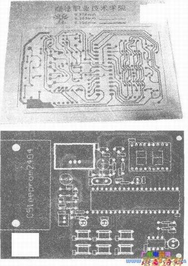 将线路图用激光打印机打印在“硫酸纸”上,在暗房环境下曝光、显影、定影、清洗后即可在溶液里腐蚀。清洗残留的腐蚀液,便得到完好的PCB板。见上图
