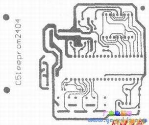 4、热转印法用绘图软件编辑好线路板的走线图,见中图,用热转印纸通过激光打印机输出1:1的线路板图,把打印面贴着覆铜板后用热烫斗或过塑机在转印纸的背面反复加热,把热转印纸撕下来后就会看见原来激光打印机的油墨热转印到覆铜板,见下图。
