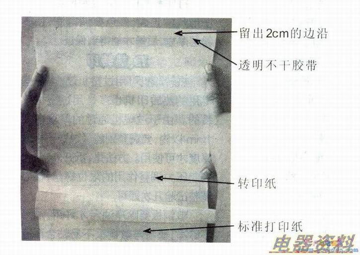 第四步,用透明不干胶带将转印纸的上边沿粘在标准打印纸留出的空白处,粘贴时一定要平整,并将超出标准打印纸外的透明不干胶修剪掉,如下图所示。