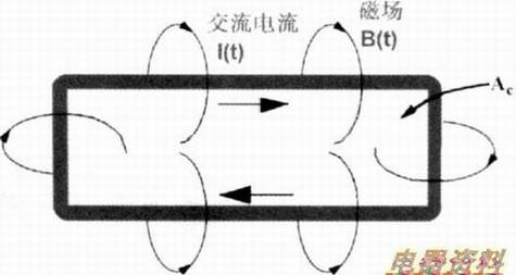 图2(a)中的环路类似于只有一圈线圈绕组的电感。可以看到高频率交流电流所产生的电磁场B(t)会环绕在此环路的外部和内部。如果高频交流电流环路面积(Ac)很大,就会在此环路的内外部产生很大的电磁干扰。