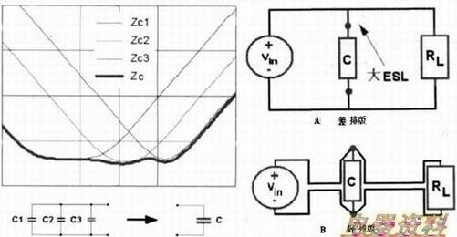 图1(a) 多个电容器并联可改善阻抗特性 图1(b) 滤波电路PCB走线方式A差,B好
