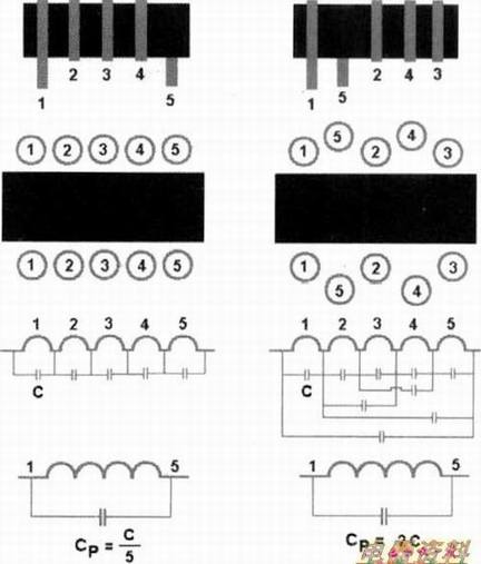 图2(b) 中第一种电感的五圈绕组是按顺序绕制。这种线圈结构所产生的等效并联电容值(CP )是单组线圈等效并联电容值(C)的五分之一。图2(b)中第二种电感的五圈绕组是按交叉顺序绕制。其中绕组#4和#5放置在绕组#1#2#3之间而绕组#1和#5非常靠近.这种线圈结构所产生的等效并联电容值(Cp)是单组线圈等效并联电容值(C)的两倍。