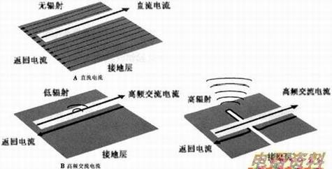 图3(a)中的A图是当直流电流在一个接地层上方流过时的情景。此时在地层上的返回直流电流非常均匀地分布在整个地层面上。图3(a)中的B图显示当高频交流电流在同一个地层上方流过时的情景。此时在地层上的返回交流电流只能流在地层面的中间而地层面的两边则完全没有电流。假设图3(b)中的地层面是开关电源PCB上的接地层(Ground Plane),设计人员应该尽量避免在地层上放置任何功率或信号走线。一旦地层上的走线破坏了整个高频交流环路,该电路会产生很人的电磁波辐射而破坏周边电子器件的正常工作。