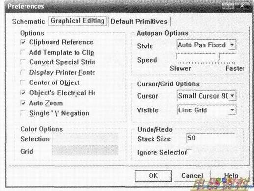 采用上述方式进行复制粘贴操作时,Protel99SE默认状态下会将图纸边框一起复制,若要取消图纸边框,可在复制之前,在Prote199SE的原理图编辑环境中执行菜单“Tool工具\Preference优选项”命令,在对话框中点击Craphal Editing标签,将Options选择框中的AddTemplate Clipboard前的勾选项取消(如下图所示),再进行复制粘贴操作即可。