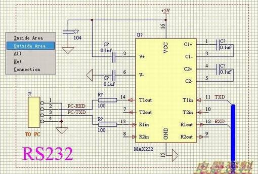 1.首先,按下键盘"S",然后选择Outside Area,然后根据RS232的虚线框选取整个RS232模块,请看图1,你会发现除RS232模块外,其他被选取了,为什么要这样做,呵呵,看了下边步骤,你就明白了.