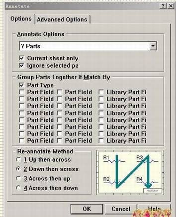 2.接着Tools->Annotate,在Option选项中,我们把Annotate Option选为: ?Parts,勾选Current sheet only和Ignore selected part,接着在Re-annotate Method中选择你需要排列的顺序,具体设置请看图2.