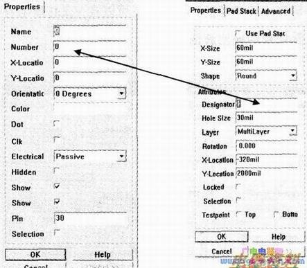 ②找到出错的元件封装,在PCB库编辑器中修改该封装中的焊盘编号(Designator),使之与原理图元件引脚编号一致。并更新到PCBc,上述两种方法,其目的都是使元件引脚编号与封装焊盘编号相互一致。如下图头所连的两栏。