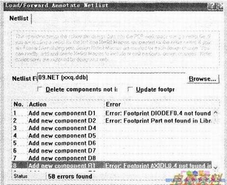 网络表装载时可能会出现的各种类型错误,如下图所示。共有58个错误。面对这些错误。该从哪里着手纠错,只有了解出错的原因。才能找到正确纠错的思路和方法,并取得事半功倍的效果。从装载网络表的宏操作(Action)可以看出,装载网络表的第一步是添加新元件(Addflewcomponent),也就是在文档已经加载的封装库中调出该封装。并把已经调出的封装分配给具体的元件,使原理图中的元件逐个地添加到PCB中。让每一个元件按标号对应一个封装;第二步是添加网络(Addrlewnet)将原理图中的网络逐个地添加到PCB中;第三步是添加节点(Addnewnode),在这一步,首先根据原理图中元件管脚编号找到对应的焊盘,并把它归属到对应的网络中,其实质就是在具体元件(封装)的焊盘上建立连接关系;为便于理解。可用如下的比方来说明,假如要发放某本课本(封装),首先仓库要有这本书,并把它领出来(在PCB文档中加载封装库),接着在书上写上姓名发给学生(添加元件),最后再核对自己的课本每一页(网络)内容(节点)。如果仓库中没有这本书。或有这本书但没有领出来就没有办法在书里写上姓名再发给学生。更没有办法让学生去核对课本内容。由此可知,封装影响元件,元件又影响网络和节点。要解决装载网络表时出现的错误,其正确步骤应是:先解决封装类错误。再解决元件类错误,最后解决网络和节点类错误。因为封装没有发现将导致元件无法添加,元件无法添加又会导致网络和节点无法找到。
