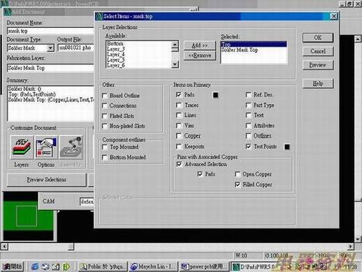 5. 若零件pad是由pad与copper作associate,在出底片作cam 时应在solder mask选择Top ' with associate copper'advanced selsction'pads 'fil copper