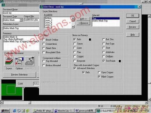 5. 若零件pad是由pad与copper作associate,在出底片作cam 时应在solder mask选择Top ' with associate copper'advanced selsction'pads 'fil copper