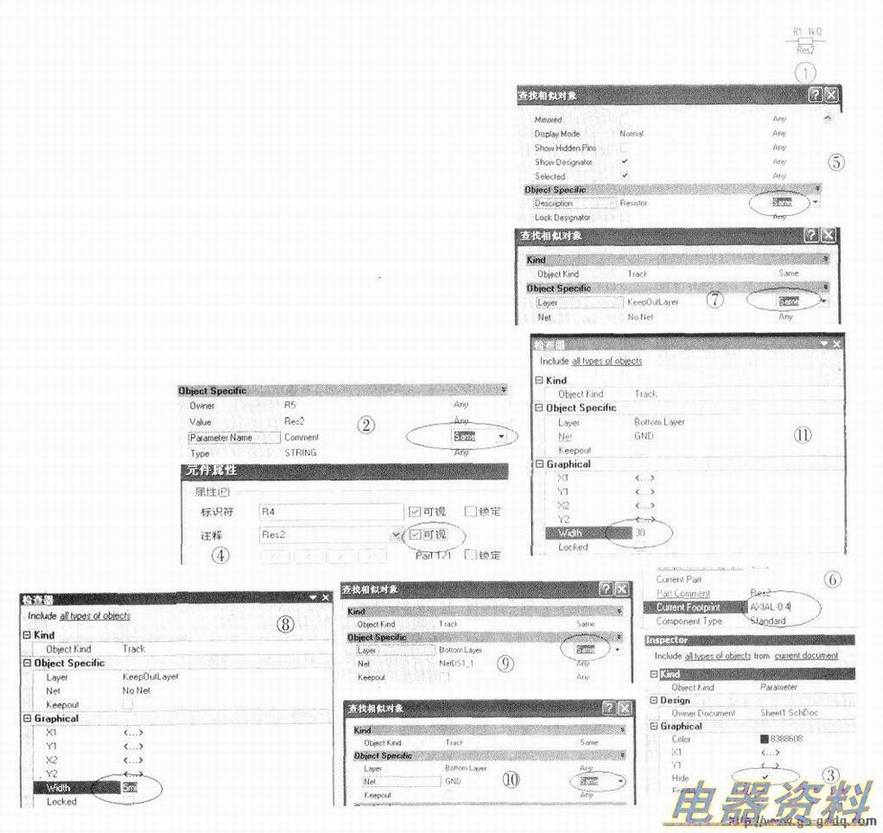 先找到原理图中的任何一个元件.如图1中的Rl,删除Rl的注释Res2.先选中Rl的图形符号,右键点击工作界面空白处,在出现的快捷菜单中,选中“查找相似对象”后,出现十字光标。点击Rl的注释Res2,出现“查找相似对象”对话框,只改动其中一项,见图2,再点击“确认”,可见原理图中所有元件的注释全部选中。点击隐藏在工作区面板的“Inspector”