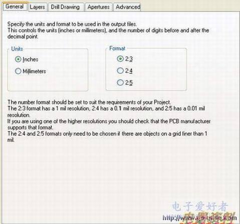 在全局设置中,可以指定输出的Gerber 文件的单位(Units)和格式(Format),单位可以是公制(Millimeters)和英制(Inches);格式定义可以设置相关数据的精度,为 加工指定对象放置的精度。如,2:3 表示1mil 的分辨率(1mil=1/1000 inch)。如果设计中对象放置的网格为1mil,你在输出Gerber 文件时应将格式设置小于1mil。