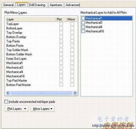 在层设置中,选择要输出产生Gerber 文件的层定义;还可以指定任何需要产生镜像的层定义。同时,还可以指定那些机械层需要被添加到所有的Gerber 图片。