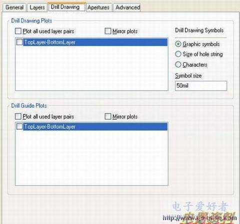 在绘制钻孔设置中,可以指定那些层对需要一个钻孔绘制;还可以指定用于表示各种尺寸钻孔绘制符号的类型和大小。同时,还可以指定那些层对需要一个钻孔向导文件,钻孔向导是一幅可以标定PCB 上每个钻孔点的图。