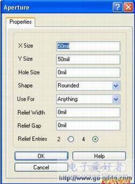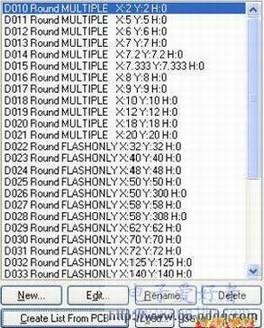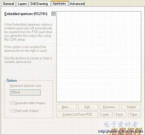 在光圈设置中,可以使能或设置设计中特定的光圈信息。当使能了嵌入式光圈(RS274X)参数,系统将会自动为输出的Gerber 文件产生一个光圈列表并根据RS274X 标准将光圈嵌入在Gerber 文件中,为此,将不必担心是否当前的光圈列表中已经包含了所有必要的光圈信息。如果没有使能该参数,需要在主要的光圈区域内调用、编辑或添加符合要求的光圈表。