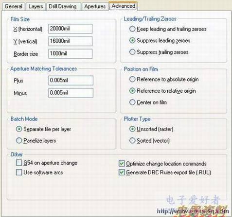 在高级设置中,诸如在输出Geber 文件时的可视的胶片尺寸、光圈匹配公差及零抑止等参数将可以被指定。使能Center on film 参数,产生的Gerber 数据将自动定位在胶片的中央。在该栏中,还可以设置输出图片是矢量(vector)或光栅(raster)类型。