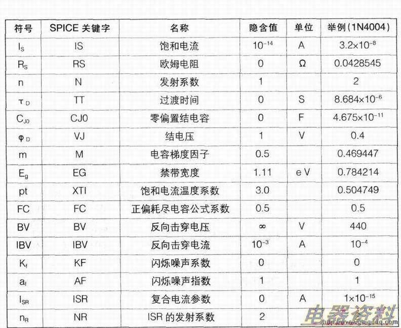 二、二极管模型参数(见下表)