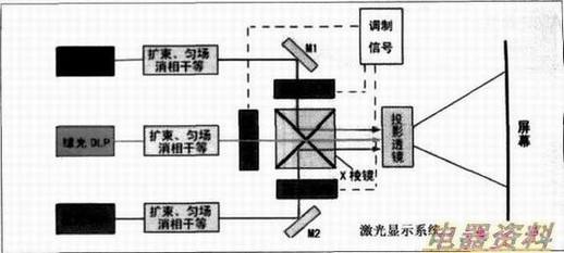 激光显示系统主要由三基色激光光源、光学引擎和屏幕三部分组成。光学引擎则主要由红绿蓝三色光阀、合束X棱镜、投影镜头和驱动光阀组成,光阀驱动使光阀上分别生成红、绿、蓝三色对应的小画面.然后分别引入三色激光照明投影到屏幕上,即产生全色显示图像。激光显示技术路线从图像生成方式上又分为扫描式和投影式。
