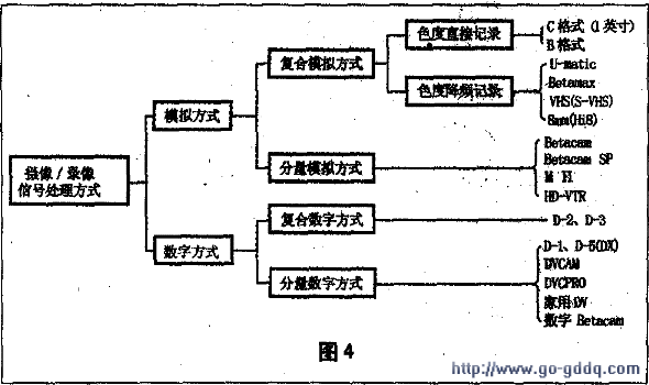 2.按信号处理方式分类摄录机从信号处理方式上来分有模拟方式和数字方式,每一种方式中又分为复合方式和分量方式,如图4所示。