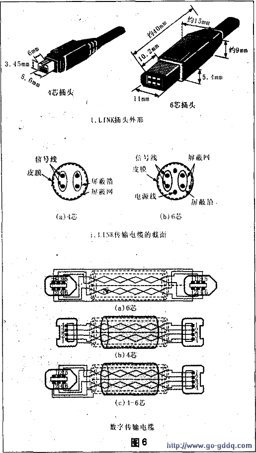 DV摄录机采用的记录方式为数字分量方式,即记录的视频信号为数字亮度信号和数字色差信号,这种数字信号在传输时采用统一的格式,按IEEE1394的标准规格,因而它也使用统一的数据传输线如图6所示。这种数据线具有多芯双向传输功能,摄录一体机输出的音频和视频数据信号和输入的音频视频数据信号都可用它传输,同时还可传输控制信号,对摄录机进行录放控制。大大方便了DV机的使用。