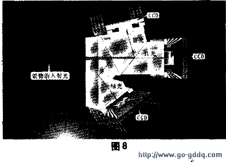 流行的CCD摄像机从使用CCD的数量上来分有单片CCD和3片CCD两种。家用袖珍摄录机(即DV机)多使用单片CCD,结构简单、成本低。专业用的摄录机多使用3CCD,如图8所示。镜头中的分光棱镜将光图像分解成R、G、B三基色光,分别由三个CCD转换成R、G、B三基色图像,分三路信号分别处理。这种摄像机图像质量高,电路较复杂,光学系统也复杂,因而成本也高。另外根据数字高清电视的需要,也开发了感光面为16:9的高清CCD摄像元件。