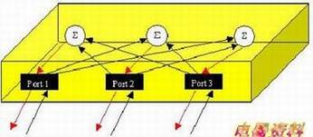 当信号从任一端口进入HUB以后,HUB则将这个信号进行放大后传输到其它的所有端口。也就是说从Port1进入的数据,HUB是不关心它要去哪里,只是将信号放大后传输到Port2和Port3就算完成任务了。这样对于100M带宽的HUB来说,某一时刻整个网络只有一个信号在传输,而且这个端口只要是接受数据的时候就不能发送数据,也就是我们所说的半双工共享100M带宽。而网络交换机Switch就不同了,可以将它理解为“智能化的集线器”。因为交换机内部是有CPU和内存的,中有逻辑单元列表(LUL),列表保存着所有和这台交换机连接的网络设备的MAC地址,当某个通道有数据输入时,CPU会打开这个数据包的第一层确认这个数据包的去向,然后按照目的地的MAC地址将这个数据包送到指定的端口,参见图三。