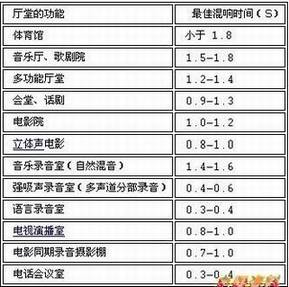 利用“赛宾公式”根据厅堂内所使用的不同吸声材料的吸声系数,分别计算出125、250HZ、500HZ、1KHZ、2KHZ、4KHZ六个点上的混响时间:T60=0.161V/ A式中,T60为混响时间,单位为S(秒);V为吸声材料的表面积;A为吸毒声量。