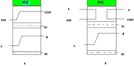 P是初级线圈,S是次级线圈,E是屏蔽层。图A.图B是变压器的线包面,A是普通变压器所测的共模电压为25Vp-p。B是将初级作两部分来绕制的,所测得的共模电压为15Vp-p,这就是所谓的平衡绕法。