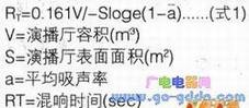 音响混响时间用下面数式计算(注:该式不包含因湿度而变动的系数在内)。