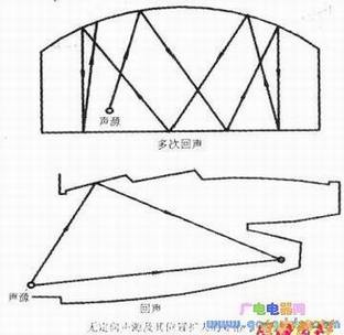 下图说明回声及多次回声产生的原因。由此可见,为了防止回声,最好校正墙面角度和安装散射体。所以,在进行平面或断面设计及布置内衬材料时,先画好平面、断面等声路图再进行探讨。