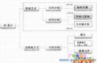 在目前的3D技术中,实现左右影像分离的方法主要采用空间分割与时间分割法。为了实现3D效果,佩戴眼镜与不佩戴眼镜所采用的具体3D技术又有所不同,且在每种方式下所看到的图像的解析度与亮度也不相同。