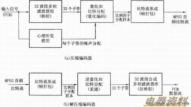 下图是MPEG音频编、的简化方框图。首先看压缩器的方框图。该编码器主要由32波段多相组(库)、量化和比特分配器、心理听觉模型和比特流形成电路等组成。其基本思路是:输入16bit的PCM数码流,进行掩蔽效应处理。