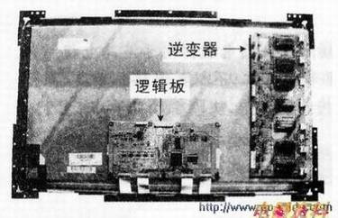 下图中虚线框内的电路和器件(逻辑坂、行列驱动板、TFT-、逆变器)的组合称为液晶屏。右图是一张32英寸液晶屏的结构实物图。