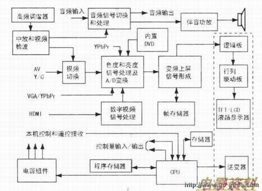 信号处理电路输入的是射频电视信号、视频电视信号、Y/C信号、YPbPr信号、VGA信号、HDMI信号和本机链控信号、遥控信号,输出的是上屏信号、视频信号、音频信号和对开关和进行控制的开/待机控制等控制信号。