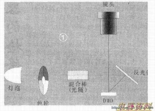 DLP投影机又称数字投影机(有的又叫数码投影机),其成像器件是 (Digital Mi.cromirror Deve).DMD是一种由数十万到数百万个微米级的微型反射镜组成的半导体,每一个反射镜对应一个,通过反射光源的光线来投影成像,根据DMD的使用数量,有单片、3片方式.目前市面上以单片方式居多。投影机光学部分示意简图(见下图)。