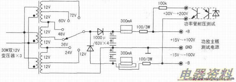 如果像维修一般家用一样,更换损坏元件后就通电试机,而还有故障,就很容易出现新换元件全军覆没的结果。连原来没有的功率管,也可能成为陪葬。因此,使用安全,增加保护措施,是专业功放维修的必备工具。下图是多功能维修中功放维修电源部分改画的电路。考虑到一般维修人员手头没有现成的多抽头,使用了三个30W双12V变压器,采用初级并联次级串联倍压整流方式,通过切换开关产生从正负15v到±100v的双电源。其表可用家用交流稳压器上使用的简易表头改制:拆除表头里的压降,在外边并联一只分流,分流的大小以通过300mA电流表头满程为准。在正负电压输出前,再分别串联一只lOOΩ/3W的电阻。在检修过程中需要供电时,断开功放主板原来的供电电路,将维修电源接人待测电路,从+15V开始逐步调高电压。如果主电解也在主板上,两个电流表指针在充电瞬间摆动后应退到左边小电流部分。随着电压的调高,电流表变化不大,而且正负电流表指示基本一样。如果电路依然有故障,表针会明显右摆。这时,应关闭电源,做进一步检查。因为变压器只有30W,电流过大时压降会增大,电路中串联着ioon的电阻,当电路还有故障、电流过大时,电阻会冒烟警告,从而确保功率管不会再次损坏。此电源还有功率管耐压测试和测试功能,o般功率管c、e结耐压应在200V以上,把电压切换到最高挡时,正、负输出之间的电压达到200V,如果此电压加在功率管集电极与发射极之间,电流表指针不摆动,说明该功率管耐压没问题;如果电流表有电流指示,说明这只管子不能用了。