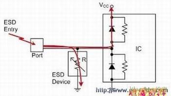 如图5所示,IC上的轨对轨 负责将剩余的或“允通”电流导入VCC(它一般会通过旁路 器 回到GND)。很难确定什么样的等效电阻适于为IC实现ESD保护,但是无疑比板上ESD器件高得多。