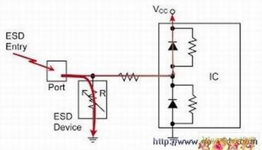 为了帮助降低流入IC的峰值电流,可以将 电阻器 串联在外部ESD器件和IC之间,如图6所示。