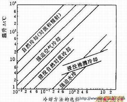 按照上图,可以得出冷却方法的选择顺序:自然冷却一导热一强迫风冷一液冷一蒸发冷却。体积功率密度低于0.122W/cm3传导、辐射、自然对流等方法冷却;0.122-0.43W/cm3强迫风冷;0.43~O.6W/cm3液冷;大于0.6W/cm3蒸发冷却。注意这是温升要求40℃时的推荐参考值,如果温升要求低于40℃,就需要对散热方式降额使用,0.122时就需要选择强迫风冷,如果要求温升很低,甚至要选择液冷或蒸发冷却了。