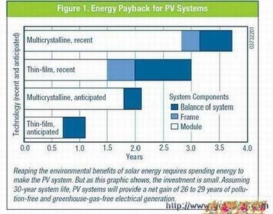 能源偿还时间(Energy Payback Time, EPBT)是衡量太阳能电池使用过程中产生的能量补偿制造过程中消耗能量所需的时间。美国国家可再生能源实验室(NREL)的报告显示,光伏太阳能组件收回能源成本的时间在1~4年之间,因电池种类而异(最新的CdTe电池EPBT不到1年)。考虑到太阳能电池能持续工作30年,光伏系统可以提供26~29年零排放的电力。 还听说过关于太阳能更多的流言吗?把你想知道的告诉爱PV,我们会帮你鉴别那是“真实”还是“谎言”。