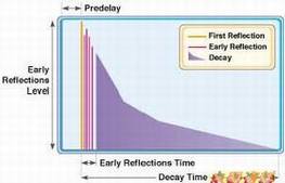 为了研究的方便,声学上把混响分为几个部份,规定了一些习惯用语。混响的第一个声音也就是直达声(Directsound),也就是源声音,在效果器里叫做dryout(干声输出),随后的几个明显的相隔比较开的声音叫做“早反射声”(Earlyreflecteunds),它们都是只经过几次反射就到达了的声音,声音比较大,比较明显,它们特别能够反映空间中的源声音、耳朵及墙壁之间的距离关系。后面的一堆连绵不绝的声音叫做reverberation。