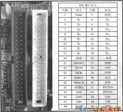 IDE接口损坏的故障表现是不认硬盘和不认光驱,此时可以用测量IDE接口的阻值来判断是IDE接口损坏了还是与它相连的或损坏了。下图所示为IDE接口的定义。