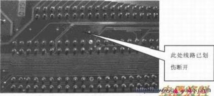 由于IDE线路断线造成不认硬盘、光驱的故障,在维修中也时而碰到,这种故障使用观察法就可以明显地看出来,只要将线路修补好就行了,如下图所示。