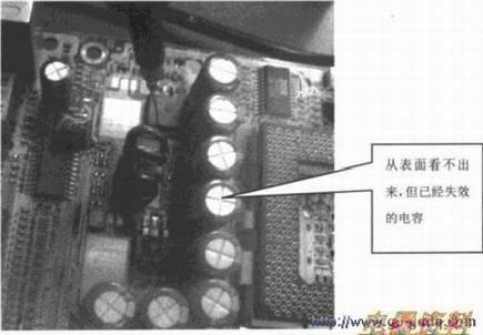 有的电容从表面看起来没有损坏,但用检测时,发现容量变小或已消失,再也不能使用了,如下图所示为通过检测发现容量已经消失的电容,此时换上相同容量的电容一股就正常了。